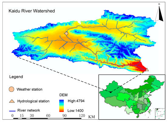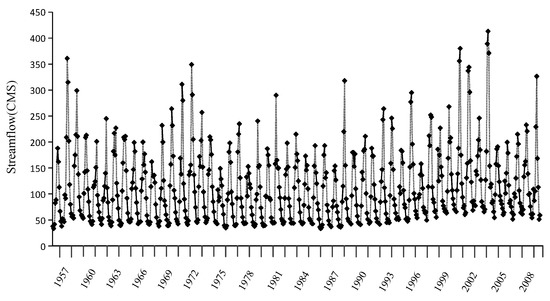The Kaidu River Basin (Figure 2), located in the middle reach of the Tarim River Basin, plays a key role in water supply to municipality, industry, agricultural, stockbreeding and forestry sectors in Xinjiang province of China. It lies between the latitudes of 42°14′ N and 43°21′ N and longitudes of 82°58′ E and 86°05′ E [36]. The Kaidu River Basin experiences a typical inner-continental climate, with an average annual temperature of 4.16 °C. The spatial and temporal distribution of precipitation in the Kaidu River Basin is heterogeneous with an average rainfall of 273 mm/year Huang et al. [37]. It exhibits plentiful snowmelt water in spring, concentrated ice-melt water and rainfall recharge during the summer, significant temperature differences during the autumn, and frequent early frost in winter. More than 80% of the rainfall occurs between May and September [38]. The study site is Dashankou hydrological station, which is located at the Kaidu River Basin outlet. The Kaidu River Basin above Dashankou hydrological station has a catchment area of 18,827 km2 with the mean elevation of 3100 m. The data of streamflow records are obtained from the Dashankou hydrological station for the period of 1957–2009. The unit for streamflow is in cubic meter per second (CMS). The monthly variation of streamflow is shown in Figure 3, with a maximum value of 413, a minimum value of 33.2, a mean of 110.54, a standard deviation of 68.77, a skewness of 1.37, and a kurtosis of 5.07.