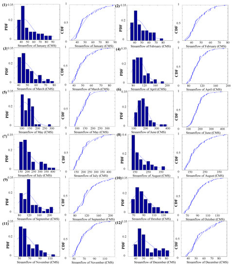 As a measure which is regularly employed in model evaluation studies, RMSE indicates the deviation between generated monthly streamflow and observed monthly streamflow. Most RMSE values in Table 2 are small. The maximum value of RMSE is 10.28. This means that the maximum deviation between generated monthly streamflow and observed monthly streamflow occurs in July, while the minimum RMSE can be observed in March with a value of 1.20. The K–S test can quantify the largest vertical difference between the hypothesized and empirical distributions [31,41,42]. Therefore, it can be used to verify if the sample data of monthly streamflow follow the marginal distribution generated by the MECBN method. As presented in Table 2, all the p-Values calculated from K–S test are higher than the significant level α = 0.05, where is the K–S test statistic. The results indicate that observed monthly streamflows in the Kaidu River Basin could be appropriately represented by the marginal distributions generated by MECBN.