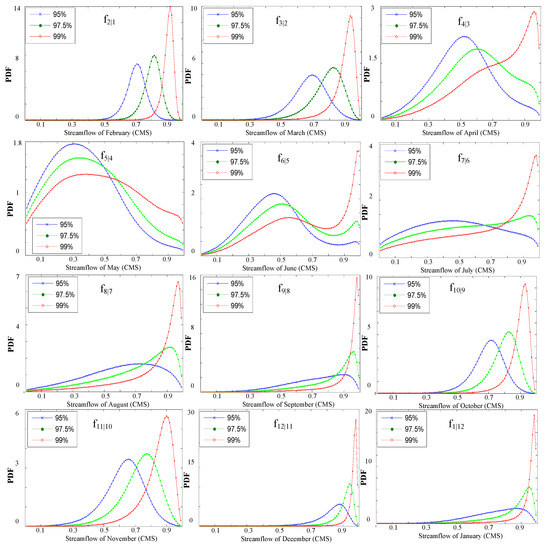 Once the marginal and joint distributions are fitted to streamflow records in the Kaidu River Basin, the conditional distributions of adjacent monthly streamflows can be derived according to Equation (11). The streamflow status is classified based on the quantile. In this study, 95, 97.5 and 99 percentile values reflect qualitative information on probability distributions of the scaled monthly streamflow of the Kaidu River Basin. They are used as streamflow classification schemes at high level to explore the conditional distribution. As the streamflow has been scaled into [0,1], 95% means that the streamflow is 0.95. The relationship of conditional distribution of two adjacent months has been transformed to the exploration of the distribution of the streamflow in each month given the streamflow status (0.95, 0.975, 0.99) in the last month demonstrated in Figure 5.