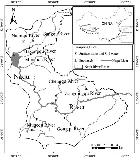 River and soil waters were sampled on 20–23 August 2016 in the Naqu River basin, and further sample collection from upstream to downstream in the Naqu River basin was conducted on 4–10 January 2017. In total, we collected 27 samples of surface water (14 samples in January, 13 samples in August), 13 samples of soil water in August, and 5 samples of snowmelt in January. Thirteen sample sites were chosen around the mainstream and tributary of the Naqu River basin. The sampling sites are shown in Figure 1. Twelve water samples were collected from the main stream and three tributaries, and then stored in glass sampling bottles for 2H and 18O analysis.