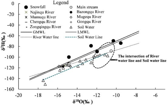Figure 3 is related to the sampled waters. As shown in Figure 3, the slope and intercept of both the river water and soil water lines were lower than those of GMWL (8,10) and the LMWL (7.9,6.29) in August. The average deuterium excess of surface water was 3.17‰, which was smaller than the GMWL (10‰), implying a slower evaporation process in August. The slope of soil water regression was 7.65, which was larger than the Naqu River water line (5.60). The evaporation of soil water was not obvious. The slope (4.9) and intercept (−24.9) of the snow line were lower than the slope of GMWL (8,10) and the LMWL (7.9,6.29) in the winter.