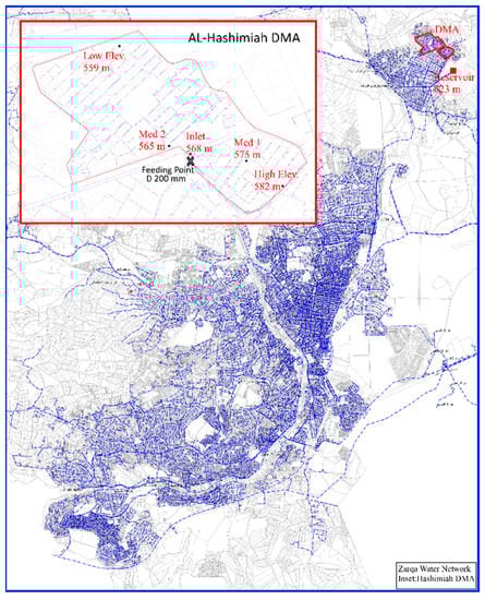 Map of Zarqa water network showing AL-Hashimiah DMA and positions of the data loggers (inset).