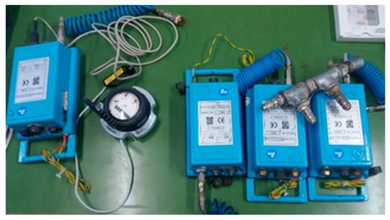To measure the flow and pressure in the DMA, Multilog data loggers from Radcom Technologies, Dallas, TX, USA (Type: RDL662LFQ61-SMS) with a memory of 48,720 readings were used. Although the loggers can be programmed to record the measurements every second, they were programmed to record the measurements every 15 min, to handle reasonable data for several days and to conserve the batteries of the loggers until the DMA is saturated. A mechanical flow meter of Sensus, Hannover, Germany (Type: WP-Dynamic 100) with a starting flow of 0.25 m3/h, maximum flow of 300 m3/h and ±2% accuracy was installed at the inlet of the DMA and connected to a data logger in a manhole that was constructed to protect the equipment. Four other data loggers were installed to record the pressure data at four selected points and attached to customer properties, to represent the pressure in different elevations in the DMA. Figure 2 shows the loggers used to record the flow and pressure measurements. Accordingly, 2928 measurements were recorded over five days, 488 records for the flow measurements at 15 min. time intervals, and other 488 pressure records at 15 min time steps for each of the other five pressure loggers.