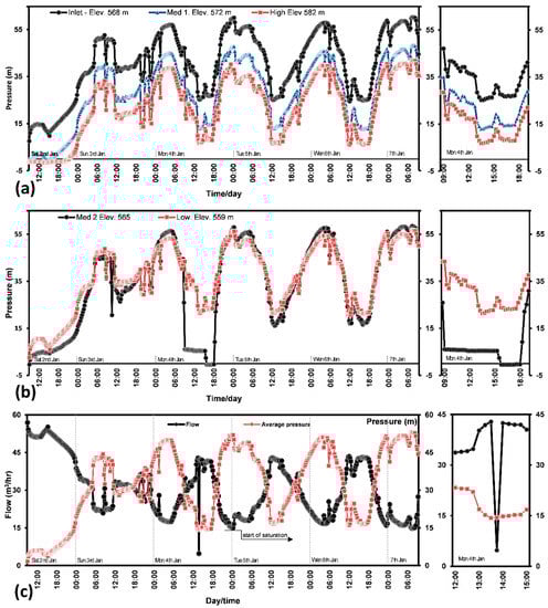 Figure 3 shows the pressure and flow measurements in the DMA during the period of the experiment. Figure 3a shows the logged pressures in three points: the inlet point, a med-elevation point and a high-elevation point, showing the range of the pressure in the DMA. Pressure of the DMA ranges from 6.0 to 60.0 meters with a mean of 32.4 m and 14 m standard deviation.