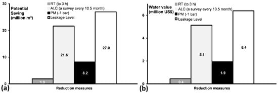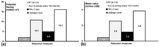 Potential water saving of different leakage reduction measures. (a) volume of water saving (b) value of water saving.