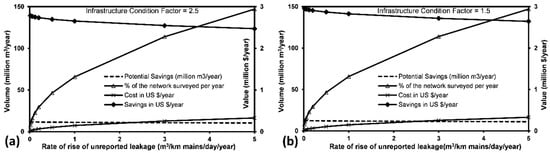 Sensitivity of rate of rise of unreported leakage: (a) infrastructure condition factor = 2.5; (b) infrastructure condition factor = 1.5.