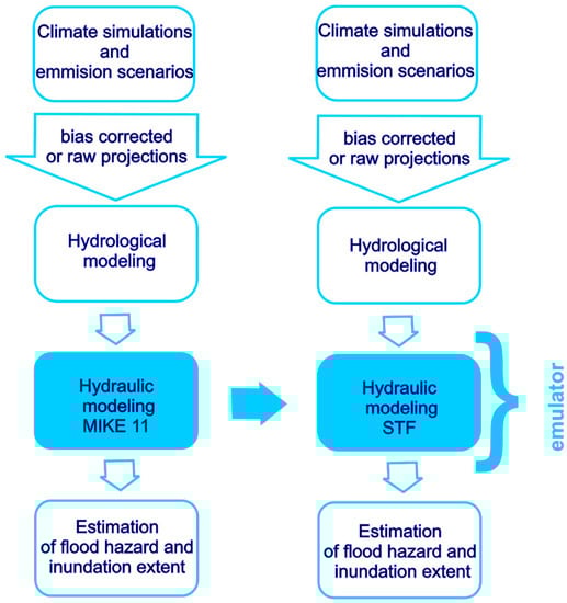 The following content is organized within sections that present the methodology, describe the case study area, describe the emulator, discuss the results and the uncertainty of the results of both MIKE11 and the emulator of MIKE11, and apply the developed procedure to climate projections. Final comments on the achievements of this work are given in the conclusions.