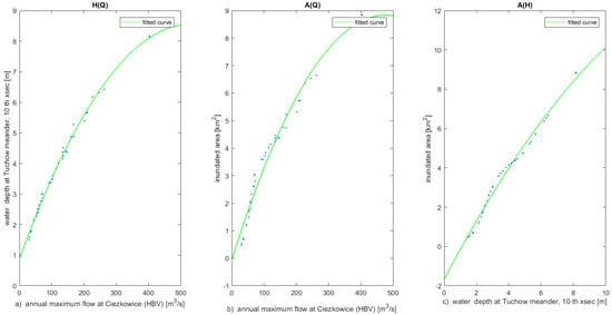Dependence on hydrological input (annual maxima) and routing model predictions for the Tuchow meander for the reference period 1971–2010. (a) Water depth values at the 10th cross section of the meander versus the maximum annual flow; (b) inundation areas at the Tuchow meander versus the maximum annual flow; (c) inundation area versus the maximum annual water depth at the 10th cross section of the Tuchow meander. Blue dots denote the data, and green lines denote the fitted curve to the square polynomial.