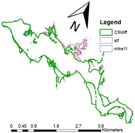 Figure 7 presents differences in the extent of maximum inundation area for the year 1997 for the lower part of the Tuchow meander. The emulator shows about 3.5% larger inundation area than MIKE11. The critical success index was used [,] to assess the differences quantitatively. The assumes that the times when an event is not expected and not observed have no consequence. The equation is as follows: