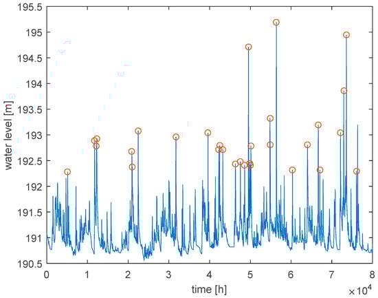 From the point of view of flood risk assessment, only the water level values that are above the bank-full are of interest. As the Koszyce Wielkie river reach has high embankments, the water level values that cause inundation upstream or downstream of Koszyce Wielkie are still in-bank at that cross section. In order to estimate their uncertainty related to the emulator parameters, the peak values above the 75th percentile (above 192 m) were selected from the generated ensemble of hourly water levels. The approach of [] was followed in choosing the high-flow event series. The minimum distance between the events was set to 40 h, following the analysis of flow residence times to avoid the correlation between the events.