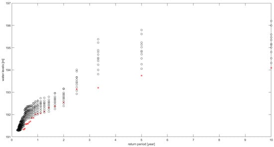 Figure 9 presents an example of an empirical relationship between the return period and water levels obtained for the 10-year long time series of simulated water levels at the Koszyce Wielkie gauging station for the period 1991–2000. The black-marked curves correspond to nine different parameter sets of the Monte–Carlo ensemble simulations, while the red-marked curve is obtained for the observed time series.
