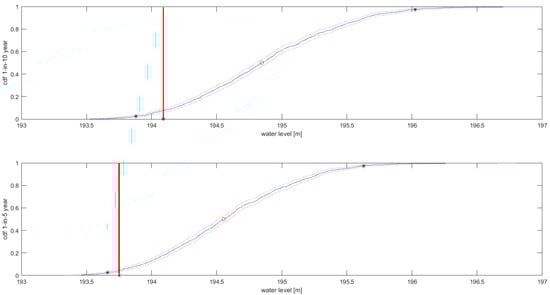 Empirical cumulative distribution function (cdf) of water levels with 1-in-10 year return period (upper panel) and 1-in-5 year return period (lower panel) obtained for the Monte Carlo (MC) simulations of peak water levels at Koszyce Wielkie (blue lines); red dotted lines show the cdf 0.95 confidence bounds; black stars show the 0.025, 0.5, and 0.975 quantiles water levels with 1-in-10 and 1-in-5 year return periods; the observed water levels corresponding to 1-in-10 and 1-in-5 year return periods are shown by the red lines.