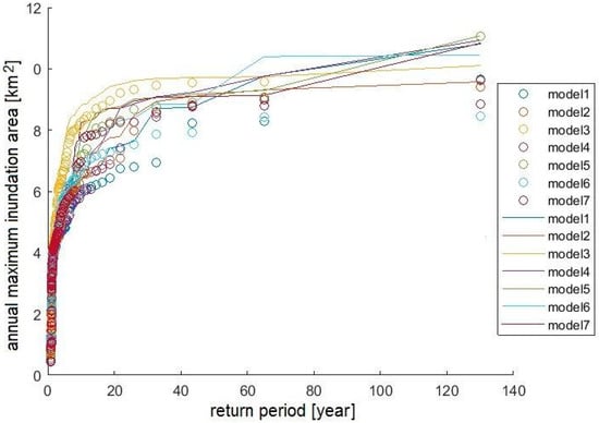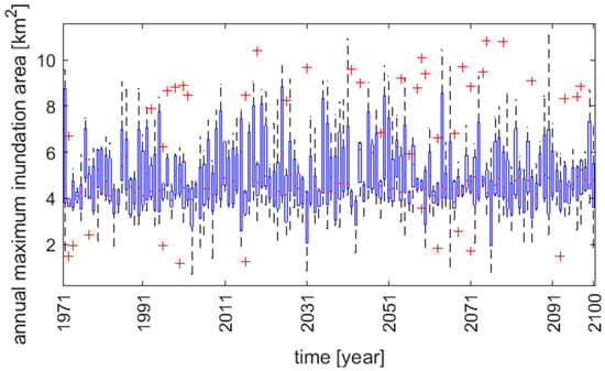 The projected maximum annual inundation areas for the seven models show a stationary character, which results from a stationary character of the annual maximum flow projections for the Biala Tarnowska []. However, looking at the outliers denoted by red crosses, the increase in annual maximum inundation areas can be found. Closer examination of precipitation projections (not shown here) reveals that 130-year daily raw precipitation data contain peaks of extreme precipitation, which are caused by the regional climate model instability (the so-called one-grid storms). These abnormal events may lead to wrong conclusions on the future projections of extreme high flow events when linear regression models are used to analyze future trends and the uncertainty of the projections is not taken into account [].