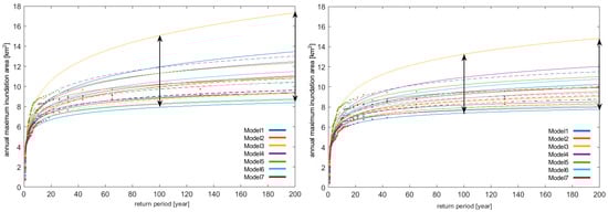 Annual maximum inundation area over a 100-year return period (marked with a black double arrow) and a 200-year return period (marked with a black double arrow), with instabilities (left plot) and without instabilities (right plot), the 95% and 5% confidence bounds (respectively with the Models, solid colorful lines), and MLE (dashed lines).