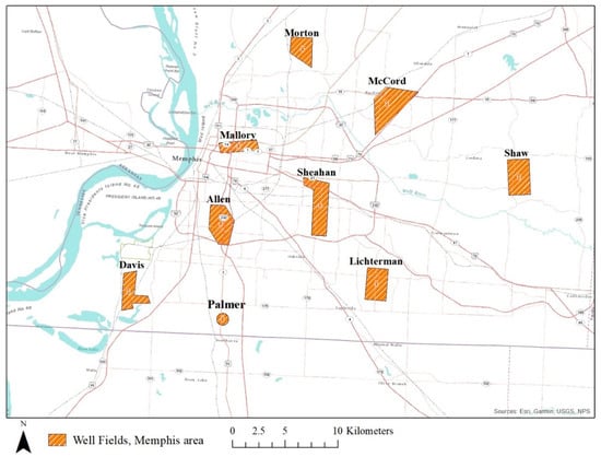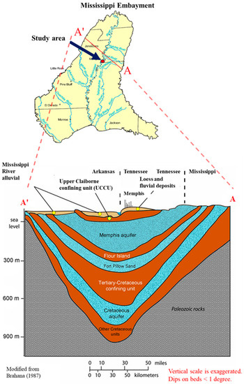 - Brahana, J.V.; Broshears, R.E. Hydrogeology and Ground-Water Flow in the Memphis and Fort Pillow Aquifers in the Memphis Area, Tennessee. 2001. Available online: https://pubs.usgs.gov/wri/wri894131/pdf/text_wri89-4131_1.pdf (accessed on 20 December 2018).