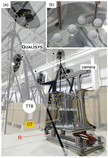 The movement of the containing cylindrical tank is captured with a commercial optical motion capture system from Qualisys. All six degrees of freedom (DoF) are determined based on the relative position of the markers, which are mounted on the rigid acrylic structure [,,,]. The Qualisys system is also capable of simultaneously tracking multiple independently moving reflective markers in the three translational degrees of freedom. Hence, the possibility of capturing the free water surface with additional floating markers randomly located inside the structure can be explored.