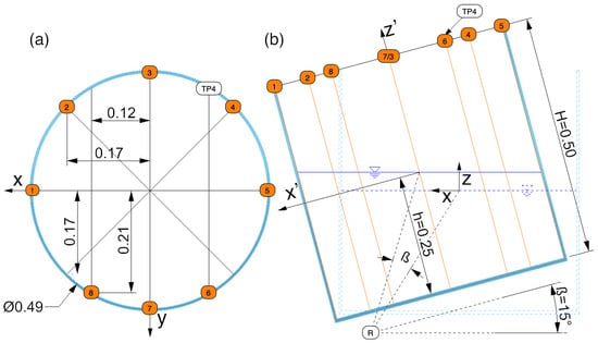 One Edinburgh Designs WG8USB Wave Gauge Controller is used for the presented work. The sample rate is 128 Hz []. Figure 2 shows the location of each wave gauge. In total, all the available 8 gauges are used, which is the capacity of a single controller. The rotation axis R for the following presented experiments (Section 3.2) is parallel to the y-axis. The wave gauges are arranged in four pairs with equal distance to the y-axis. In addition to the quadrants, the two wave gauges and are located at octants and have the equal and y distance of = 0.173 m. With an coordinate of for the and , the y-value is = 0.212 m. For the evaluation of the inclination tests an additional marker (tank point, Figure 2) is needed. The -coordinates of this point are with an offset of approximately 10 mm and height of the cylinder H of 0.5 m. The origin of the local coordinate system is located in the centre of the tank and on the initial water level h of 0.25 m. The measurements of the Qualisys system are based on a different global coordinate system, which is defined as part of the calibration. The results are transformed into a local coordinate system, which has its origin at the tank point (Figure 2).