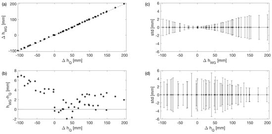 Comparison of the methods with a variable water depth h inside the cylinder—(a) comparison between water depth captured with the marker balls via Qualisys (Q) and wave gauges (WG); (b) absolute differences between the methods; (c,d) standard deviation (std) for each method.
