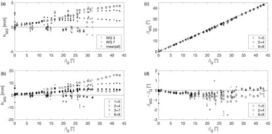 Influence of variable pitch angle on the wave gauges (WG)—(a,b) analysis of the measured changes in the free surface; (c,d) comparison between the measured angle and the calculated based on the wave gauges pairs.