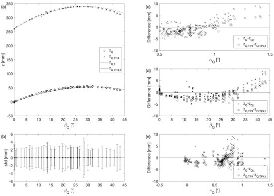 Influence of variable pitch angle on the floating markers—(a) comparison of the theoretical with the measured z-coordinate of the reference point and the free surface; (b) standard deviation of the measured balls; (c–e) absolute difference of the z-coordinate in relation to all three rotation axes.