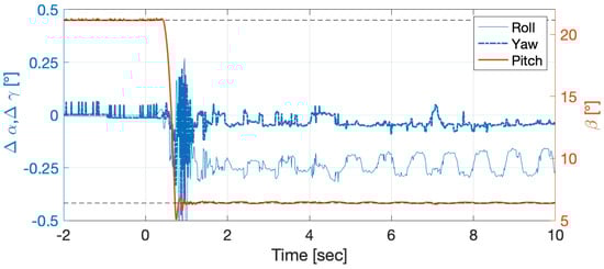 For a further analysis, the same data-set is plotted in relation to the measured roll angle in Figure 5c and the yaw angle Figure 5e. A comparable behaviour to the angle could be found for around 1°, but not for . This indicates that the complete system is not completely rigid and includes a small inclination around the x-axis and a part of the differences can be explained as a result. The standard deviation of the measurements of the marker balls (Figure 5b) show the same range as found by changing the water level h inside the tank (Figure 3d; Section 3.1).
