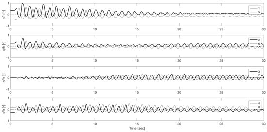 A fundamental difference between the two measurement systems is their point of reference. The locations of the infra-red markers are captured and reported based on a global reference frame which is independent of the position of the cylinder. The wave gauges are directly connected to the cylinder and thus measure the free surface in the local frame of reference of the cylinder. In contrast to the previous applications of onshore wave run-up probes [,,], the orientation of the WGs changes according to the movement of the body on which they are bonded. Those tests allow to explore whether this effect on the measurement is significant or not.