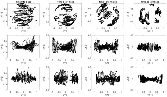In addition to the wave gauge results, the elevation of each of the 12 free surface marker balls can be plotted. Figure 8 uses a different approach to show the three-dimensional motion of the markers. Four different time periods were chosen. For each period of record, the measured coordinates of all the 12 points were plotted in one graph. The top view (upper row) shows that the balls have the tendency to group together. Nevertheless, a good coverage is maintained. The side view of the first 5 s time period also captures the overflow with a -value near to 1 [-], which fortunately did not result in the loss of a marker. The change of the main oscillation direction can also be observed in the measured data of the marker balls (going from 3rd to 4th column in Figure 8).