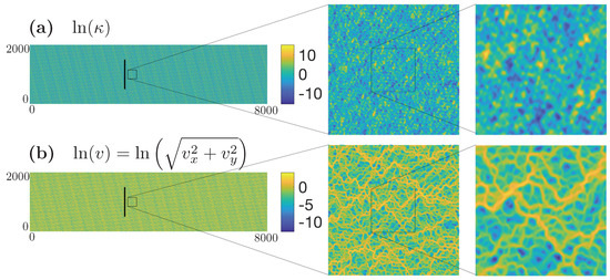 to obtain our velocity fields, where v is the velocity , is pressure, and is viscosity. System (1) is solved using a finite volume method [57]. At the boundaries we impose permeameter like conditions: no flux across the lateral boundaries and constant head at the upstream and downstream boundaries. The mean velocity can then be rescaled to any desired value, so for convenience we choose . Figure 1b shows the natural log of the absolute value of the velocity , where and are the velocity fields in the horizontal and vertical directions, respectively. The flow domain was generated to be large enough so that when we simulate transport the solute will not interact with the boundaries. Domain lengths in the x and y directions equal to and , respectively, were deemed sufficient for this purpose.