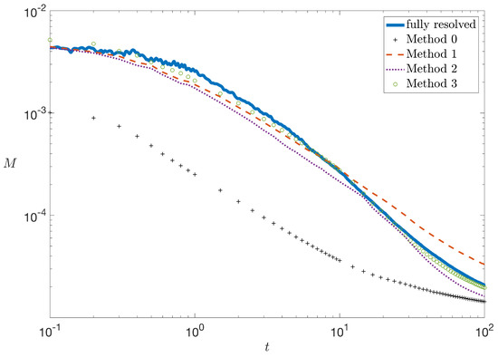 The integral of the squared concentration, M, versus time for the fully resolved random walk model and the different versions of the upscaled model described in Section 4.