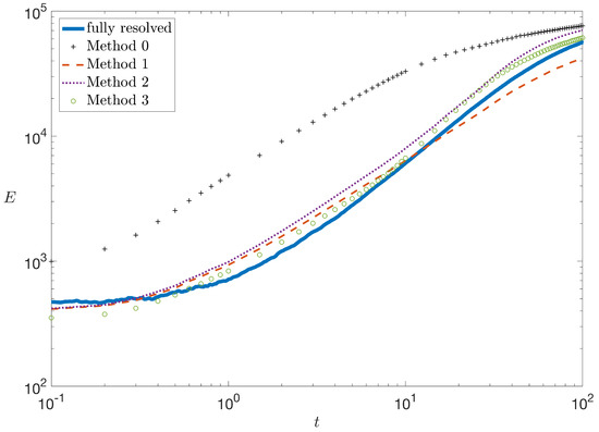The dilution index, E, versus time for the fully resolved random walk model and the different versions of the upscaled model described in Section 4.