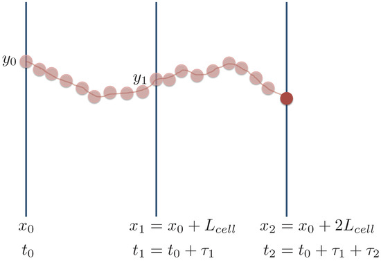 Diagram illustrating the parameterization step for the upscaled model. Each particle moves by random walk over a distance of two cell lengths and the particle’s initial y position (), y position at the inlet of the second cell (), and travel times through the first and second cells ( and , respectively) are recorded. The red circles represent an example of a single particle trajectory.