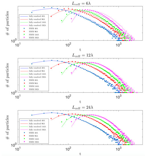Figure 7 shows the histogram of particle x positions for both the fully resolved and upscaled models at various points in time throughout the simulation. This figure shows that the downscaling method described here does a reasonable job of predicting the x positions of particles relative to the small scale simulation. While it is certainly not perfect, we deem this sufficient and choose it as the method we will use to predict particle x locations for all cases. A feature that can be observed is that longitudinal particles’ locations are better matched as time advances (compare, for instance, results in Figure 7a–c to Figure 7d–f). This is consistent with the fact that our method considers a constant longitudinal velocity across a single step and therefore ignores subscale fluctuations that appear to average out across multiple steps of a single particle. Finding a good method to guess the y location of a given particles requires more effort, and we propose several different methods in the following sections.