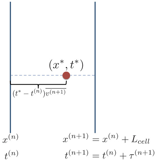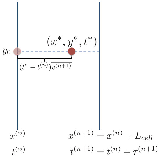 Illustration of the downscaling procedure in the x direction. A particle is in Cell and will travel through that cell over an amount of time . We want to determine the particle’s x location at time .