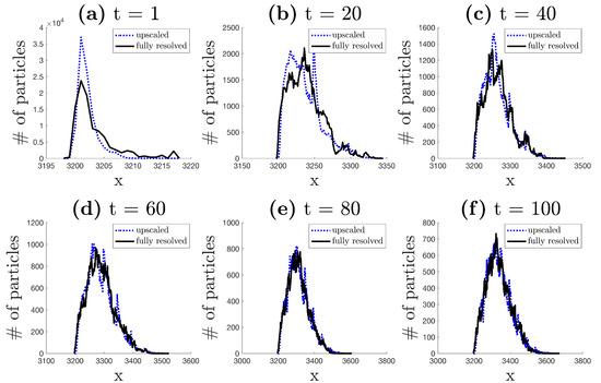 Histogram of particle x locations at times (a) t = 1, (b) t = 20, (c) t = 40, (d) t = 60, (e) t = 80, and (f) t = 100 for both the fully resolved particle tracking simulations (solid black line) and the Spatial Markov model with the downscaling method described in Section 4.1 (dashed blue line). The bin size selected for the histogram is the same as the fully resolved grid resolution.