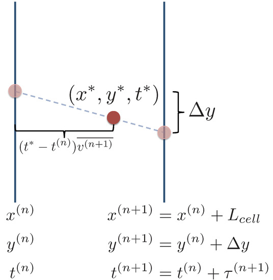 Illustration of the downscaling procedure Method 2 in the y direction. A particle is in Cell and will travel through that cell over an amount of time . The particle’s x location is determined using the method described in Section 4.1. We predict the particle’s y location at time using Method 2.
