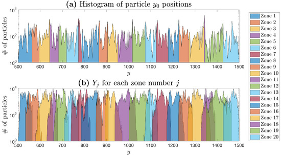 After defining our zones, we then create a set of y values, , for each zone number j. The set contains all of the y positions measured in the trajectories for every particle that had in Zone j. This means that contains every y value from each particle trajectory defined by that had its initial y position, , located in zone number j. In this study, is a set containing y values. Figure 10b shows the histogram of the set of y values for each zone number j. The adjustment of the parameterization step is illustrated in Figure 11.