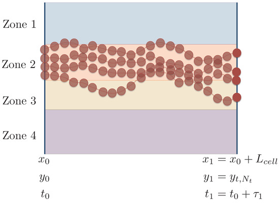 After defining our zones and determining the set of y values associated with each zone number j, we will now use this information in our downscaling procedure. In this method, we will determine the downscaled y position of each particle at some time by randomly selecting a y value from the set of possible y values, , associated with each particle’s zone number j. The particle’s zone number depends exclusively on its initial y position, , and does not change at any point throughout the simulation. For example, a particle that had in Zone 2 will always draw from the set of possible y values associated with that zone, . Thus, the downscaled x and y positions at time are given by