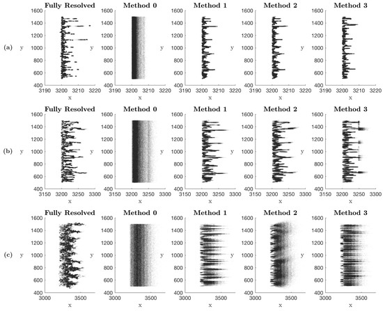 Particle locations for the fully resolved simulation, Method 0, Method 1, Method 2, and Method 3 at (a) 1, (b) 10, and (c) 100.