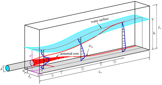 The offset jet flow was widely used as energy dissipation downstream of hydraulic structures—for example, the submerged hydraulic jump at an abrupt drop could be considered as an offset jet flow. From an engineering point-of-view, the length of the stilling basin should be as short as possible. The focus of this paper is to find the factors affect the efficiency of energy dissipation of the offset jet flow. Figure 1 shows a sketch of the submerged offset jet in a pool. The jet is mainly divided into three regions according to the relationship with the floor, viz., recirculation region, impingement region, and wall jet region. The Cartesian coordinate system is used with x, y, and z representing the streamwise, lateral direction, and floor-normal direction, respectively. The exit of the jet is at x = 0, and the symmetry plane is at y = 0, the pool bottom is at z = 0. The symbols Lx, Ly, Lz, S, d, ht, Uj, and Um represent the length, width, and height of jet pool, offset height, the diameter of jet exit, depth of tailwater, bulk velocity, and cross-sectional streamwise maximum mean velocity, respectively. Likewise, if the jet exit is rectangular, a0, b0 represents the height and width of the rectangle, respectively. The flow field in jet pool can be divided into three zones by the decay of Um: (a) the potential core zone, where Um was equal to the jet exit velocity, Uj; (b) transition zone, where the decay of Um was rapidly in this zone; and (c) fully development zone, where the decay of Um became very slow.