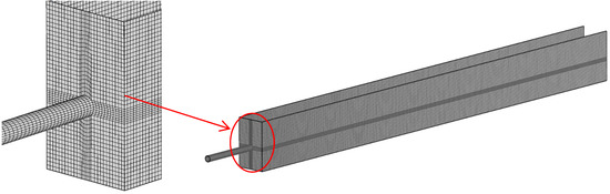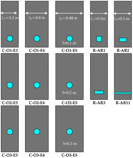 ANSYS ICEM 16.0 (ANSYS®, Canonsburg, PA, USA) was utilized to develop the numerical models for 13 types of offset jet. Hexahedral grids were used throughout the computational domain. The grid meshing is shown in Figure 2. A Cartesian coordinate system is used so that the origin is at the center of the intersection of the offset wall and floor. The computational domain consists of the pipe and jet pool. The jet is discharged from offset wall offset by a height S above the floor. The total pipe length is 1 m, and the type of pipe can be divided into the circular pipe and rectangular pipe. The length, Lx, and height, Lz, of the pool are 8 m and 0.8 m, respectively. For the circular pipe, the offset ratio (OR) varied from 1 to 3, the expansion ratio (ER) varied from 3 to 4.8 as the width of the jet pool increased from 0.3 m to 0.48 m. For the rectangular pipe, the aspect ratio (AR) of the exit varied from 0.33 to 11.46. Moreover, the area of exit remains constant for all shape of exits. The parameters of all cases are given in Table 1, and the jet exits and the offset wall are shown in Figure 3.