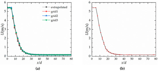 (a)Velocity profiles on jet exit axis with three grid sizes; (b) Results from grid 2, with discretization error bars computed using GCI.