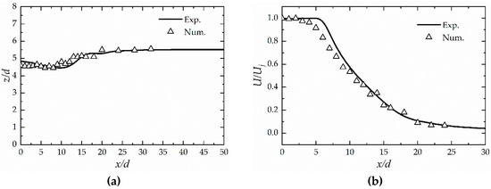 The attenuation of the jet flow in the narrow and deep pool was characterized using the decay of the cross-sectional maximum streamwise mean velocity (Um). Previous studies indicated that Um is constant within the potential core region, followed by a rapid decay with streamwise distance in transition zone [32,33]. The entrained ambient fluid gets momentum since the jet enters the pool, the section of jet flow continues to expand, and the velocity is decreasing as the results of the mixing of jet and ambient fluid. Figure 7a shows the distribution of Um normalized by the jet exit velocity, Uj. Normalized values of Um were observed decayed sharply within the region x/d > LPC and the trend of decay of Um varies greatly in the transition zone for different circular offset jet. It can be seen from Figure 7b that the length of the potential core zone (LPC) varied from 5.0 to 5.5 with changes in ER, and a higher ER indicated a higher LPC.