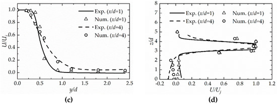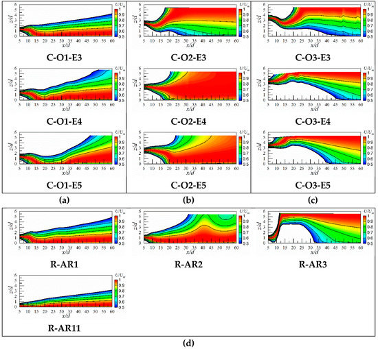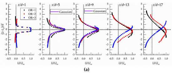Profiles of the streamwise mean velocities (U) extracted at x/d = 1, 4, 9, 13 and 17 are shown in Figure 10. It may be noted that to cover a range of ER = 4, Cases C-O1-E4, C-O2-E4, and C-O3-E4 were selected; otherwise, using the data of all Cases would make the plots clumsy. The velocity and length scale used was Um and d, respectively. Here, zc is the distance from the center of exit to the floor, that is, z − zc = 0, where is the axis of the jet exits. Vertical profiles of U are shown in Figure 10a for ER is 4. The effect of offset ratio (OR) on the vertical velocity spread was not evident within the region x/d < 9. It can be noted that the velocity distribution in the floor-normal direction conforms with the Gaussian distribution within the region of 5 ≤ x/d ≤ 9. However, as the jet travels away from the jet exits (x/d > 9), the data of jets at different offset height are no longer overlapped. The location of the maximum of U/Um for OR = 2 is almost at the axis of the jet exits. The location of the maximum of U/Um is above and below the axis of the jet exits for OR = 3 and OR = 1, respectively. The results reveal offset height changes travel direction of the bulk of the jet.