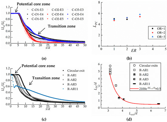(a) Um decay for circular offset jets; (b) the relationship of LPC, ER, and OR for circular offset jets; (c) Um decay for rectangular offset jets (AR ≤ 3); (d) the relationship of LPC and Lexit.