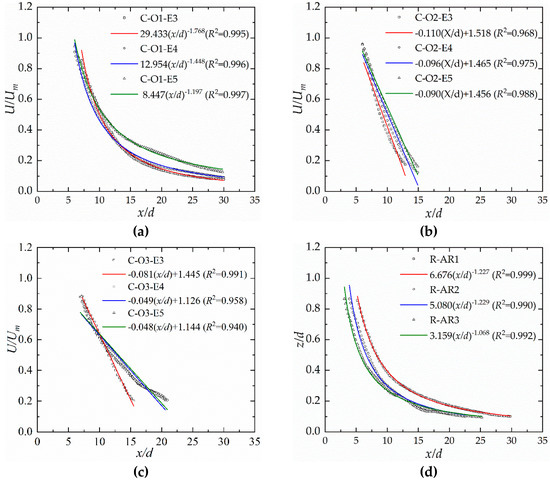 (a) power law fit to Um for circular offset jets as OR = 1; (b) linear fit to Um for circular offset jets as OR = 2; (c) linear fit to Um for circular offset jets as OR = 3; (d) power law or linear fit to Um for rectangular offset jets.