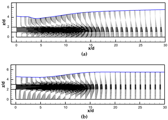 Figure 11 shows contours of U/Um in the symmetry plane for the offset jets, and the lower and upper lines represent the loci of (U = 0.5 Um, the inner separation line), and (U = 0.5 Um, the outer separation line), respectively. The jet between and was considered as the main flow in the present paper. The is the distance from the exit to where the reaches the floor, and is the distance from the exit to where the reaches the water surface. For circular exits, the main flow for OR = 1 bends to the floor at x/d = 12 ( < 12 and > 46), then the flow spreads from floor to water surface (Figure 11a). The main flow for OR = 2 spreads evenly in the floor-normal direction at x/d > 20, the values of and are roughly equivalent (Figure 11b). Furthermore, the main flow for OR = 3 bends to the water surface, with the < 20 and > 42, which means the flow in the pool is spreading from water surface to floor (Figure 11c). For rectangular exits (Figure 11d), the main flow for AR = 1 is identical to that of a circular jet. The main flow for AR = 2 spreads from floor to water surface. The main flow for AR = 3 bends sharply to water surface as the jet enters the pool, the reason is that jet is too thin to effectively maintain a stable flow pattern. As the expansion ratio increases to 11.48, the spread range of the main flow in floor-normal direction is small, and the high velocity region is close to the floor.
