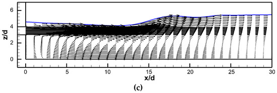 Velocity vectors of offset jet with different offset ratio: (a) OR = 1 (C-O1-E4); (b) OR = 2 (C-O2-E4); (c) OR = 3 (C-O3-E4).