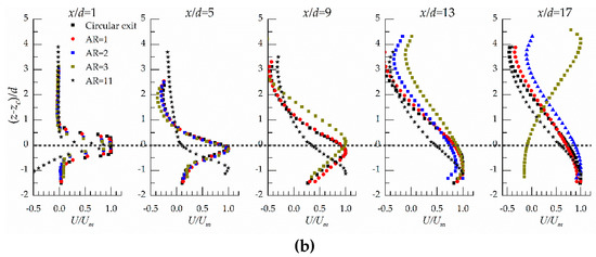Figure 10b shows the development of the U of the offset jet with rectangular exits. The results demonstrate that the bulk of the jet turns travel direction and then attaches to the floor within the region of x/d < 13. Further, the figure shows the spread rate of U is larger as the aspect ratio increases, and the flow direction for AR = 3 was changed at x/d = 17.