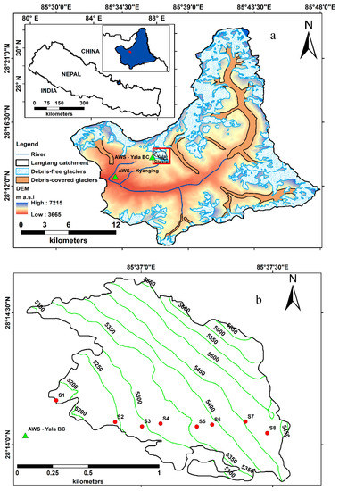 - Chand, M.B.; Kayastha, R.B.; Parajuli, A.; Mool, P.K. Seasonal Variation of Ice Melting on Varying Layers of Debris of Lirung Glacier, Langtang Valley, Nepal. Proc. Int. Assoc. Hydrol. Sci. 2015, 368, 21–26. [Google Scholar] [CrossRef]