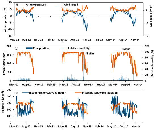 Daily mean values of (a) air temperature and wind speed, (b) precipitation and relative humidity and (c) Incoming shortwave radiation and incoming longwave radiation during 5 June–13 October 2012; 8 May–19 November 2013; and 5 May–15 November 2014.